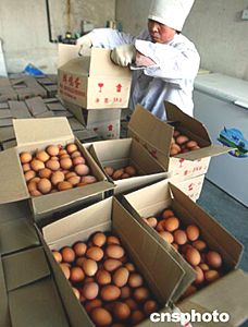 北京一家養(yǎng)雞場(chǎng)的工人對(duì)出場(chǎng)雞蛋進(jìn)行嚴(yán)格檢查、檢疫,以確保市民吃上放心蛋。目前,首都工商、衛(wèi)生等部門(mén)加強(qiáng)對(duì)市場(chǎng)活禽和相關(guān)禽類(lèi)產(chǎn)品的檢查,以防禽流感。中新社記者:宋吉河