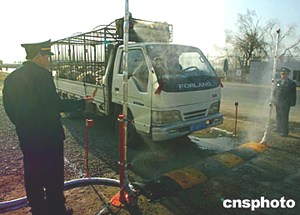 北京市相關(guān)執(zhí)法人員對(duì)外地進(jìn)京車(chē)輛進(jìn)行消毒,以預(yù)防禽流感。目前,北京市各相關(guān)部門(mén)采取積極措施,落實(shí)市政府“檢查關(guān)口前移,預(yù)防重點(diǎn)下移,嚴(yán)防死守”的預(yù)防禽流感要求。中新社記者:宋吉河