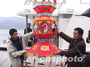 二月四日,馬尾民間節(jié)人制作的七盞大花燈在馬尾港由有關人員搬上馬祖“閩珠二號”,準備參加馬祖元宵燈會。今年元宵佳節(jié),馬祖、馬尾將第二次共同舉行“兩馬”鬧元宵燈會活動。作者:劉可耕