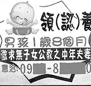 最近在臺中地區(qū)有一則夾報小廣告,登載者希望尋找沒有子女的中年公務(wù)員,收養(yǎng)他一歲八個月大的幼兒,廣告上留有行動電話,由于春節(jié)前后類似的廣告有多起,引人注意,有多人打電話詢問對方原因,關(guān)心小孩處境。