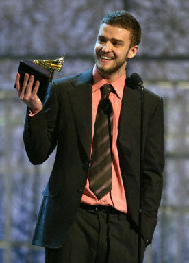 第46屆格萊美頒獎典禮今天在美國洛杉磯Staples中心舉行。圖為著名歌手賈斯汀(Justin Timberlake)獲最佳流行男歌手獎。