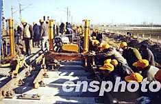 二月九日,京廣線鄭州段雙橋車站正在安裝目前中國國內(nèi)最先進的鐵路提速道岔。列車通過此道岔的時速將由過去的四十公里提高到八十公里,并且沒有咔嚓聲。作者:慎重