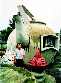 鹿谷是臺灣最著名的茶區(qū),莊文亮曾是茶廠主人,十幾年前,莊文亮“壺”(福)至心靈,突然興起創(chuàng)作大茶壺的念起,剛開始的創(chuàng)作,都只有幾十厘米或一米高,后來玩出興味,大茶壺愈做愈多,也愈做愈大,最高的達(dá)到六米,教人嘆為觀止。