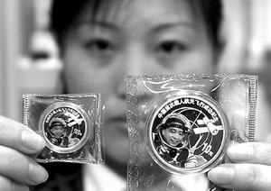 中新網(wǎng)2月11日電 據(jù)《北京青年報(bào)》報(bào)道,由中國(guó)人民銀行發(fā)行的中國(guó)首次載人航天飛行成功紀(jì)念金幣、銀幣昨天上午在京上市。楊利偉形象首次進(jìn)了金銀紀(jì)念幣。
