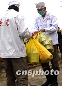 廣西南寧市良鳳農(nóng)牧公司工作人員十一日為飼養(yǎng)員送來晚飯,這家年產(chǎn)商品代雞苗1500萬羽的養(yǎng)殖場,一直堅持嚴格的規(guī)章制度,養(yǎng)殖場不許無關(guān)人員進入,飼養(yǎng)員的一日三餐都要專人送取,確保場內(nèi)無病菌。中新社記者:宋吉河