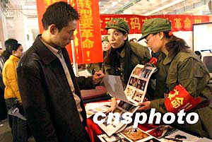 北京國際婚紗攝影暨婚慶用品禮品展覽會二月十二日在中國國際展覽中心舉行,北京一家婚紗攝影網(wǎng)的工作人員身穿綠軍服向觀眾介紹全新影樓數(shù)碼照片。