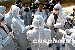 中新社隆安二月十二日電 (記者 趙勝玉)“戴鞋套、穿隔離服、戴手套”,由國務院新聞辦組織的中外記者團今天首次獲準進入中國內(nèi)地發(fā)現(xiàn)第一例禽流感的疫點——廣西隆安縣丁當鎮(zhèn)丁當電灌站采訪。
