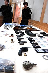 二月十三日,北京警方舉行新聞發(fā)布會,通報綁架中央實(shí)驗(yàn)話劇院演員吳若甫的詳細(xì)案情,并展示以王立華為首的持槍綁架殺人犯罪團(tuán)伙的作案工具。中新社記者:任海霞