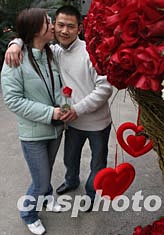 情人節(jié)之日,一位北京男士在紅玫瑰花和同心結前喜得女友浪漫的一吻。中新社記者:史利