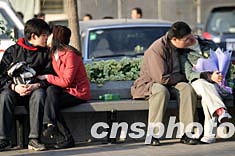 二月十四日是西方的情人節(jié),北京街頭兩對(duì)情侶在同一條長(zhǎng)椅上享受著各自的溫馨、浪漫。中新社記者:盛佳鵬
