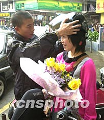 十四日下午,在澳門(mén)三盞燈一花店的街邊,一對(duì)青年購(gòu)買(mǎi)情人節(jié)玫瑰后,男青年殷勤地將頭盔幫女友戴在頭上。情人節(jié)已成為許多愛(ài)侶們共渡甜蜜、溫馨浪漫的重要節(jié)日。作者:李剛