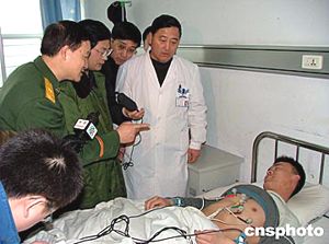 二月十五日十一時(shí)許,吉林市中百商廈發(fā)生火災(zāi)。截至十六日上午,已知有五十三人喪生,另有七十人受傷被送往醫(yī)院接受治療。圖為國家安全生產(chǎn)監(jiān)督管理局和公安部消防局有關(guān)人員到醫(yī)院看望救火中受傷的消防隊(duì)員。作者:吳兆飛