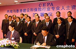 二月十七日,中國內(nèi)地與香港建設(shè)、保險行業(yè)專業(yè)人士資格互認(rèn)協(xié)議簽署儀式在北京飯店舉行,中國商務(wù)部副部長安民、香港特區(qū)政府財政司司長唐英年等出席了簽署儀式。中新社記者:武仲林