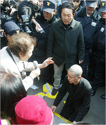 從上午11時(shí)30分起,8名慰安婦和30名韓國(guó)婦女團(tuán)體成員在該娛樂(lè)公司總部前舉行示威,要求李成延和公司負(fù)責(zé)人直接道歉。下午1時(shí)30分,抗議者表示“要讓公司負(fù)責(zé)人道歉”,并試圖闖進(jìn)公司。此時(shí),樸智友來(lái)到眾人前,朗讀道歉聲明,并跪在慰安婦老人面前表示歉意。