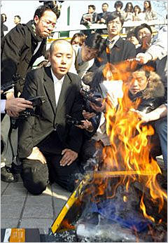 19日下午3時(shí),在位于漢城江南區(qū)驛三洞的公司總部停車場(chǎng),Netian娛樂(lè)公司在60多名記者的目睹下燒毀了1個(gè)拉面箱分量的第一次拍攝的照片和視頻膠卷。