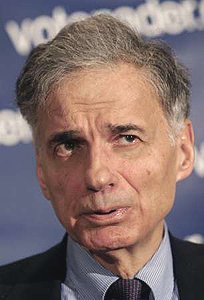本周即將年滿七十的納德二000年曾經(jīng)以綠黨候選人的身份參與總統(tǒng)大選角逐,雖然僅獲得百分之二點七的選票,但因為布什在佛羅里達和新罕布什爾兩州僅以微弱的優(yōu)勢壓倒戈爾,取得這兩州的選舉人票而登上總統(tǒng)寶座,民主黨人認為納德的得票分流了本來支持戈爾的選民,導致戈爾落敗。