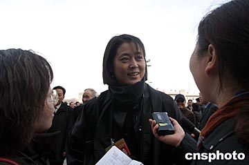 今天的倪萍穿著一身黑衣,低著頭步履匆匆前行,她還不時警惕地向左右看看,企圖躲避記者聚集的地方,眾多記者的目光已被一旁的楊瀾吸引過去,還沒注意到她。但就當她快要走到大會堂前的臺階時,被幾個熟識的記者攔住了去路。