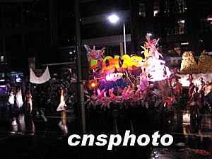 澳洲第一大城市悉尼6日晚舉行同性戀大游行,十萬人冒雨上街看熱鬧。幾十輛花車、數(shù)千人的化裝游行隊(duì)伍在雨水中緩緩行進(jìn)。最后一輛花車上書“要愛不要戰(zhàn)爭”! ≈行律缬浾 劉雨生 攝