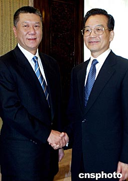 中國國務(wù)院總理溫家寶在北京會(huì)見來京列席十屆全國人大二次會(huì)議的澳門特別行政區(qū)行政長(zhǎng)官何厚鏵。中新社記者:鄭萍萍