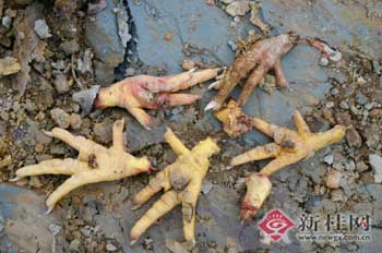 3月6日,廣西檢驗檢疫局組織人員,兵分兩路,一路查看現(xiàn)場證實確有人動過雞爪后,將現(xiàn)場作了消毒和封鎖;另一路與公安部門一起向舉報者了解情況。