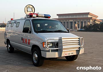 執(zhí)行“兩會”安全保衛(wèi)的武警新式防暴車在北京天安門廣場執(zhí)勤。中新社記者:張宇