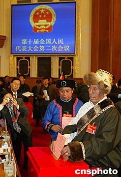 十屆全國(guó)人大二次會(huì)議三月十四日在北京人民大會(huì)堂舉行閉幕式,藏族人大代表投票表決“憲法修正案草案”。中新社記者:毛建軍