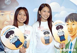 應(yīng)屆港姐冠軍曹敏莉、亞軍楊洛婷(右起)3月23日在香港出席《恒生銀行之協(xié)助警方撲滅青少年罪行比賽2004》揭幕儀式。作者:鄧慶樂