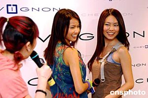 法國品牌CHEVIGNON 亞洲首家全新概念店,3月25日在香港時代廣場揭幕。香港流行音樂組合2R黃婉佩、黃婉君在時代廣場為法國品牌時裝作宣傳,演繹潮流時尚新感覺。作者:洪少葵