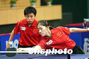 奧運乒乓球亞洲預(yù)選賽雙打比賽第二階段四月十二日晚在北京海淀體育館開賽,牛劍鋒(前)、郭躍零比四輕取中國香港選手帖亞娜、桑婭嬋,獲得六連勝,宣告成功進軍雅典奧運。中新社記者:盛佳鵬