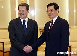 中新社北京四月十四日電(記者 齊彬)中國國家主席胡錦濤今天下午在人民大會堂會見了歐盟委員會主席普羅迪,賓主雙方進(jìn)行了友好談話。