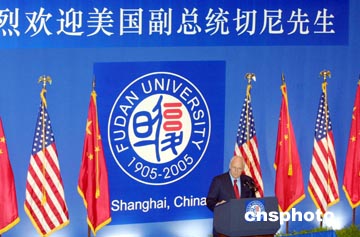 中新網(wǎng)4月15日電 美國副總統(tǒng)切尼今天在上海復(fù)旦大學(xué)發(fā)表演講時(shí)重申,在臺(tái)灣問題上,美國一貫堅(jiān)持基于“三個(gè)聯(lián)合公報(bào)”的“一個(gè)中國”原則。