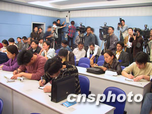 圖為情況通報會現(xiàn)場緊張忙碌的記者們。作者:郭晉嘉 范卉