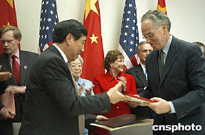 中美商貿(mào)聯(lián)委會(huì)達(dá)成8項(xiàng)協(xié)議,這是中國(guó)質(zhì)檢總局局長(zhǎng)李長(zhǎng)江與美國(guó)農(nóng)業(yè)部長(zhǎng)維尼曼簽署建立食品安全和動(dòng)植物建議磋商機(jī)制意向書。中新社記者 余東暉 攝