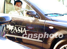 二○○四年四月二十二日,由遼寧沈陽華晨集團(tuán)提供的九十七輛“中華車”穿梭于博鰲水城,為亞洲論壇年會(huì)的與會(huì)來賓、工作人員服務(wù)!爸腥A車”此次投入服務(wù)的主要型號為2.0和2.4兩款。圖為會(huì)議中心門前印有醒目博鰲論壇標(biāo)志的中華汽車。作者:邱江波