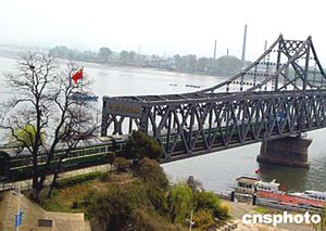 中國丹東一列通往朝鮮平壤的客運火車,四二十五日上午通過鴨綠江上的中朝友誼大橋出關(guān)開往平壤。中新社記者:宋吉河