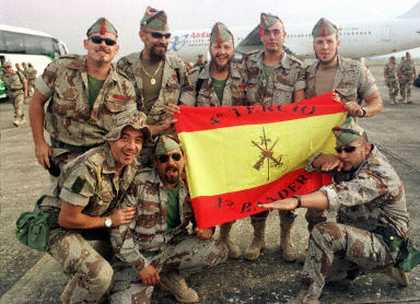 4月28日,248名西班牙最后一批駐伊作戰(zhàn)士兵乘飛機從科威特回國。圖為駐伊拉克的西班牙士兵到達西班牙西南部的Badajoz后與一面軍旗合影。