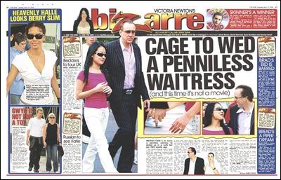 美國娛樂雜志《Bizarre》在最新一期中報道說:“尼古拉斯·凱奇將和身無分文的19歲餐廳服務(wù)生愛麗斯·金結(jié)婚。這不是電影,而是活生生的事實!