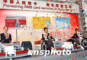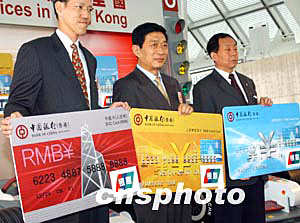 中國(guó)銀行(香港)有限公司四月二十九日在香港正式宣布,于四月三十日率先推出中銀人民幣卡系列,包括中銀人民幣信用卡和中銀卡(人民幣),設(shè)有普通卡和金卡,卡面印有"銀聯(lián)"標(biāo)志,可用于“銀聯(lián)”遍布全國(guó)多個(gè)省市約40萬(wàn)個(gè)商號(hào)網(wǎng)點(diǎn)。人民幣信用卡亦可用于香港貼有“銀聯(lián)”標(biāo)志及香港地區(qū)的中銀香港、南洋商業(yè)銀行及集友銀行屬下的自動(dòng)柜員機(jī)24小時(shí)提取人民幣或港幣的便利服務(wù)。“中銀人民幣卡系列”啟動(dòng)儀式。作者:錢(qián)興強(qiáng)