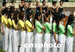 四月二十九日,在重慶參加首屆中國西部模特大賽的女選手排隊(duì)拍照,男模特在一旁欣賞美女姿容。中新社記者:任晨鳴