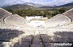 神話、史詩、戲劇是古希臘的重要文明,伯羅奔尼撒半島東南方的埃庇達洛斯劇場為公元前四世紀所建,呈圓扇面形,共有55層座位,每層兩階梯,可容納14000人。其音效奇佳,在圓心處低語或掉下一塊銅幣,坐在最后一排也能聽得真切。作者:田地