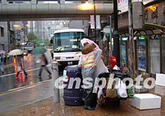 5月8日,香港天文臺上午7時20分一度發(fā)出今年首個黑色暴雨警告,歷時40分鐘。雖然黑色暴雨警告生效,但一名清潔工在街頭仍然工作。作者:譚達(dá)明