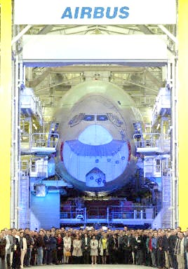 5月7日,在法國西南部城市圖盧茲空中客車公司總部,世界上最大的客機(jī)空客A380開始總裝。該公司稱,空客A380將于2005年首飛,2006年投入運營。