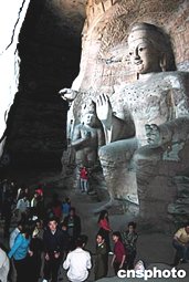 5月8日,游人們?cè)谑澜缥幕z產(chǎn)山西省大同云岡石窟群前游玩。石窟群里雕刻精美的佛像、巧奪天宮的木制建筑和美輪美奐的壁畫,一直吸引著世界各地的游客前來觀光。作者:陳帆