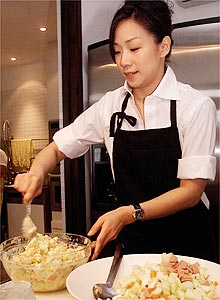 在短短半小時(shí)的烹飪示范時(shí)間里,她做了三道菜:媽媽的馬鈴薯沙拉、雪菜肉絲年糕湯,以及父親的酒釀丸子。