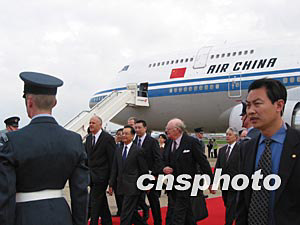 中新社倫敦五月九日電 (記者 朱大強)當?shù)貢r間今天上午十時五十分,中國國務(wù)院總理溫家寶乘專機抵達倫敦希思羅機場,開始對英國進行為期三天的正式訪問。