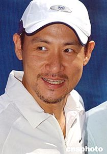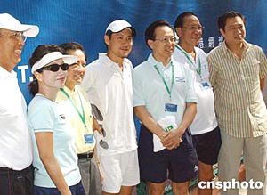 香港影視紅星張學(xué)友與著名音樂人區(qū)丁玉,五月九日代表香港明星隊(duì)參加在香港舉行的網(wǎng)球團(tuán)體邀請(qǐng)賽網(wǎng)球雙打組合。