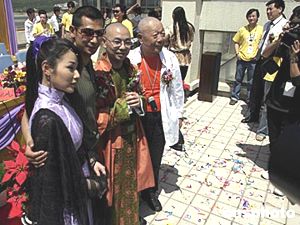 大型古裝荒誕電視劇《御前四寶》5月13日在北京市郊懷柔開(kāi)機(jī),臺(tái)灣女星鄭儀容,男星趙文卓,大陸著名主持人劉儀偉,香港老牌影星午馬(從左到右)出席開(kāi)機(jī)儀式。中新社記者:高遠(yuǎn)