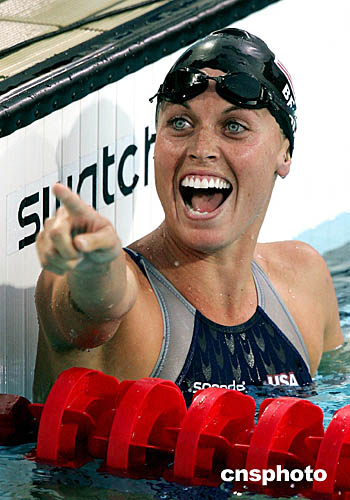 在當(dāng)?shù)貢r(shí)間8月19日舉行的女子200米蛙泳比賽中美國(guó)選手阿曼達(dá)-比爾德勇奪金牌。圖為她在得知自己奪冠后歡呼的鏡頭。
