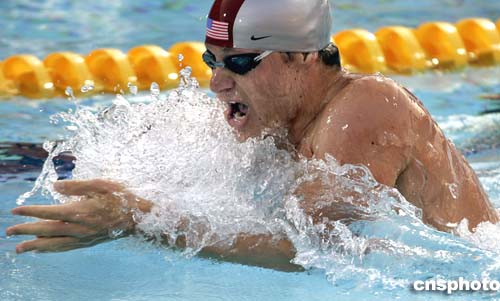 圖為8月18日,美國選手漢森在奧運(yùn)男子200米蛙泳比賽中奮力拼搏的情景,他奪得該項(xiàng)目的銅牌。