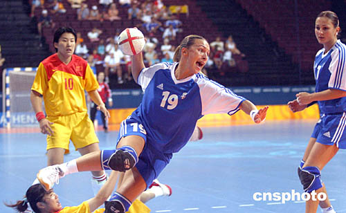 在當(dāng)?shù)貢r(shí)間8月19日舉行的女子手球比賽中,中國(guó)隊(duì)以34比13戰(zhàn)勝東道主希臘隊(duì),挺進(jìn)四強(qiáng)。圖為希臘選手在比賽中射門時(shí)的一個(gè)鏡頭。